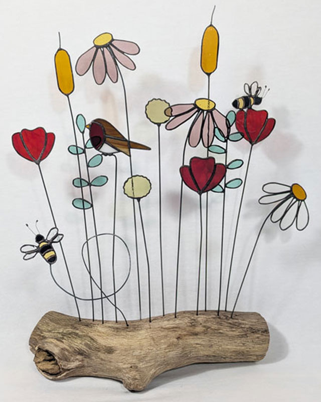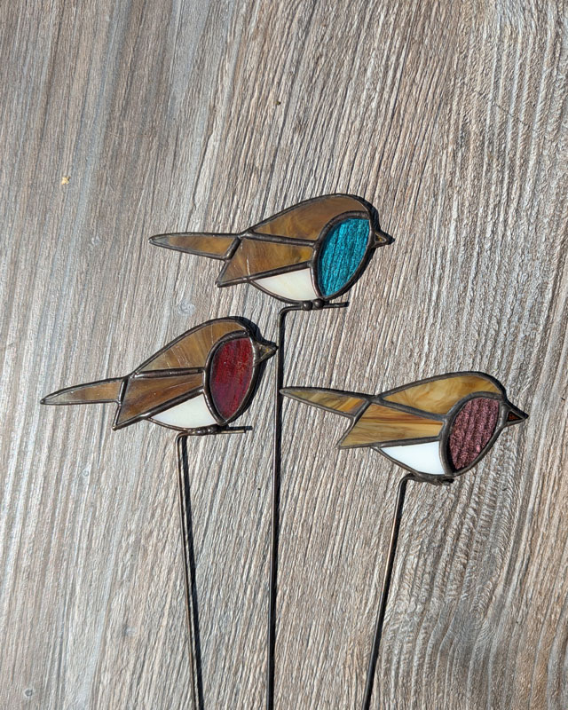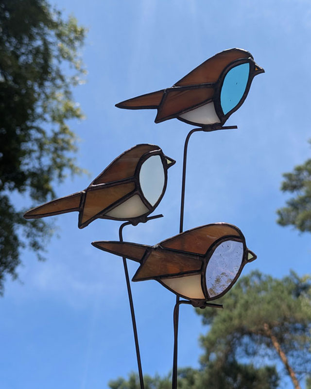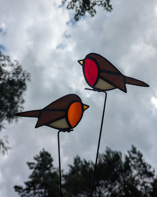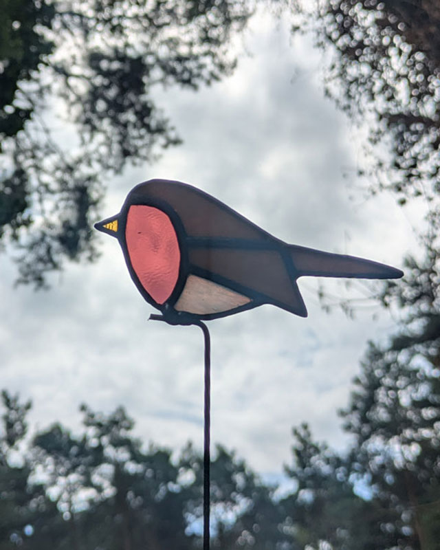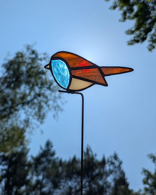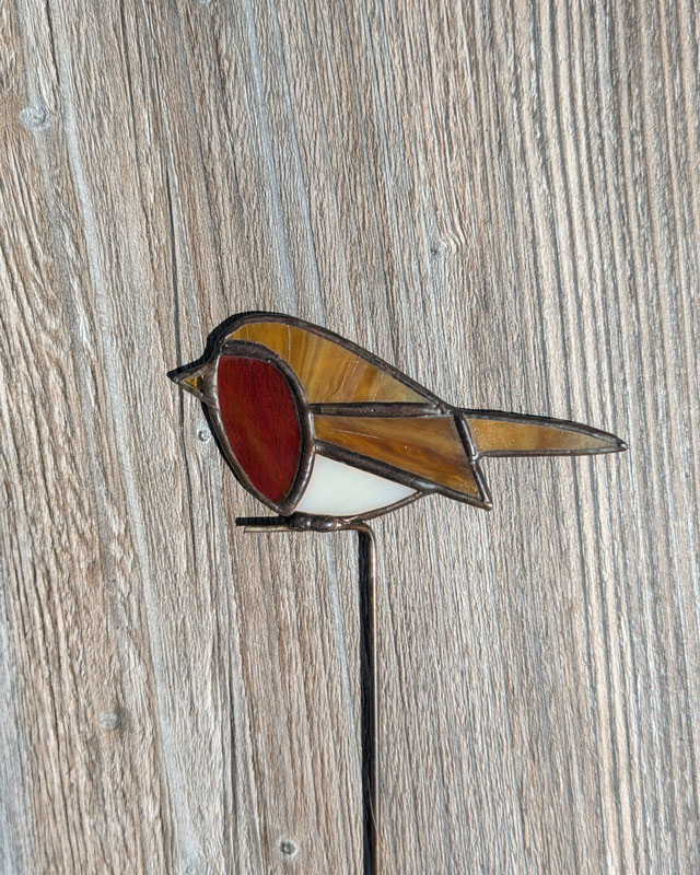 Dit vogeltje is gemaakt door middel van de tiffany-methode: koperfolie om glas. Zet de plantensteker goed in een pot of vaas, pak ‘m alleen vast bij het stokje en was je handen na het aanraken van glas in lood. Laat kinderen en huisdieren glas in lood niet aanraken. Je kunt dit vogeltje wel in de tuin zetten, maar hou in je achterhoofd dat glas in lood niet van regen houdt. De plantensteker zal sneller gaan roesten.